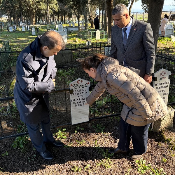 İZMİR Romanya Başkonsolosu Lilian Zamfiroiu, Dernek Başkanı Cumhur Eren ve Türk futbolunun efsane ismi Feyyaz Uçar, Yeniköy mezarlığındaki göçmen kabirlerini ziyaret ederek çiçek bıraktılar.