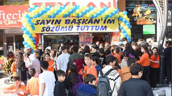 GÜNE özel olarak döner dükkânı sarı-lacivert balonlarla süslenirken, iş yerinin önüne “Sayın Başkanım, sözümü tuttum” yazılı pankart asıldı. Renkli görüntülerin oluştuğu etkinlikte uzun kuyruklar dikkat çekti.
