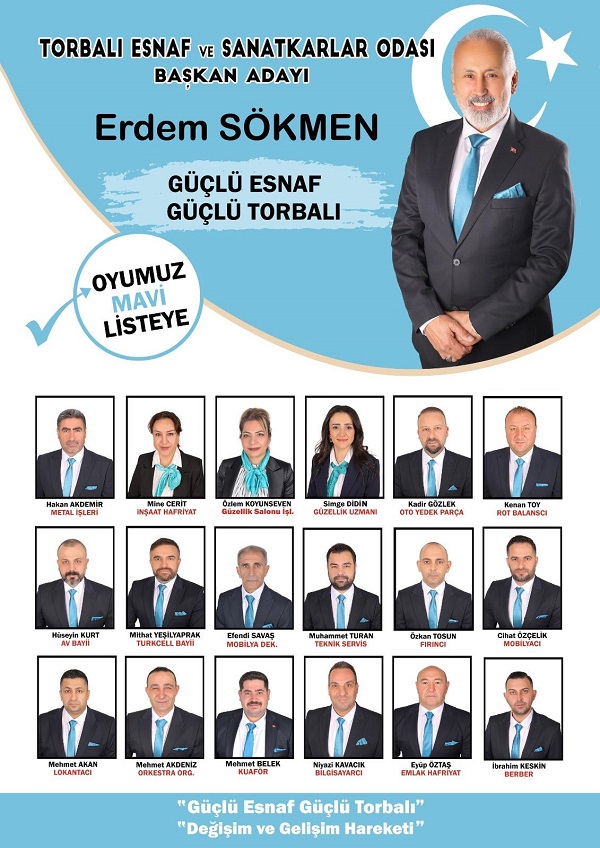 Torbalı Esnaf ve Sanatkarlar Odası başkan adayı Erdem Sökmen’in, önümüzdeki çarşamba günü gerçekleştirilecek oda seçimlerinde kullanacağı renk belli oldu. Sökmen, seçim sürecinde mavi renk ile esnafın karşısına çıkacak. Seçim çalışmalarını sürdüren Erdem Sökmen, mavi rengin birlik, güven ve istikrarı temsil ettiğini ifade etti.
