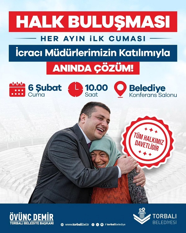 TORBALI Belediye Başkanı Övünç Demir, yaptığı çağrıda tüm Torbalılıları halk buluşmasına davet ederek, “Vatandaşlarımız gelip sorunlarını, taleplerini ve önerilerini doğrudan bize iletsin. Amacımız, sorunları yerinde dinleyip anında çözüm üretmek” ifadelerine yer verdi.