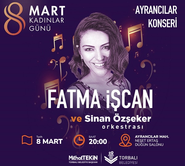 SON zamanlarda yıl kültür ve sanat etkinliklerine hız veren Torbalı Belediyesi 8 Mart Dünya Kadınlar Günü’ne özel konser düzenliyor. Konserin adresi bu kez Ayrancılar. Daha önce bölgede Ezginin Günlüğü konseri düzenleyerek, bölge sakinlerine unutulmaz bir gece yaşatan Torbalı Belediyesi bu kez sesi ile kendine hayran bırakan Fatma İşcan’ı Ayrancılar sakinleriyle buluşturacak. Türkiye’nin en saygın şeflerinden Sinan Özşeker ve orkestrasının eşlik edeceği İşcan, O Ses Türkiye programında adını duyurmuş, özellikle de ‘Bir teselli ver’ isimli şarkı ile geniş kitlelere hitap etmişti. 8 Mart günü Neşet Ertaş Düğün Salonu’nda saat 20.00’da gerçekleşecek olan konsere tüm ilçe sakinleri davet edildi.