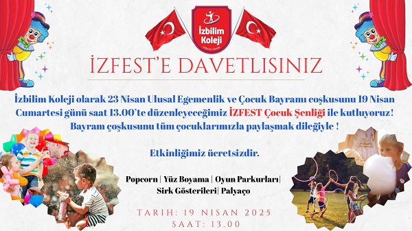 İZBİLİM Koleji yetkilileri, “Bu anlamlı günü yalnızca okul içinde değil, tüm bölge halkıyla paylaşmak istiyoruz. Amacımız, çocukların neşe içinde eğleneceği, ailelerin birlikte güzel vakit geçireceği, herkesin birlik ve dayanışma içinde olacağı bir gün yaşatmak” açıklamasında bulundu. 23 Nisan coşkusunu paylaşmak ve çocuklarla dolu dolu bir bayram yaşamak isteyen herkesi İzbilim Koleji Güney Kampüsü’ne bekleniyor.