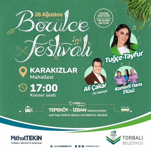 TORBALI Belediyesi hem değerlerini tanıtmak hem de kır turizmini yaygınlaştırmak amacıyla kültürel etkinliklere devam ediyor. Bu kapsamda iki hafta önce kırsal Çapak Mahallesi’nde Bardacık İncir Festivali düzenleyen Torbalı Belediyesi, üreticinin kalkınması için 28 Ağustos Pazar günü de Karakızlar’da “Börülce Festivali” düzenleyecek. Doğası, kültürü, tarımsal ürünleri ile dikkatleri üzerine çeken Karakızlar’da düzenlenecek olan festivalde Tuğçe Tayfur, TRT sanatçısı Ali Çakar ve Komedi Dans 3’lüsü sahne alacak. Festivale katılımın yoğun olması beklenirken, festival için İzmir’den İZBAN aracılığıyla gelen yolcular için saat 10:00’dan itibaren Tepeköy İZBAN İstasyonundan saat başı ücretsiz otobüs kaldırılacak.