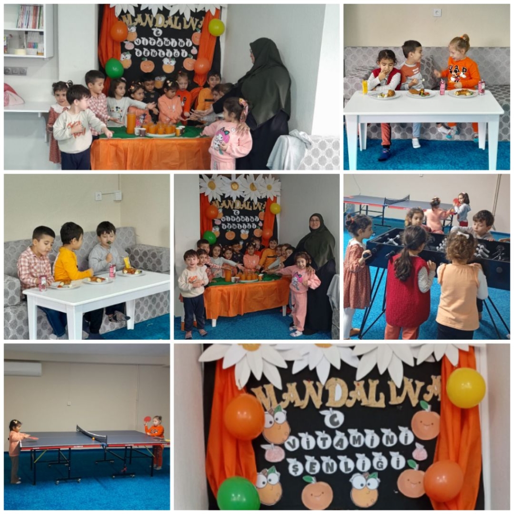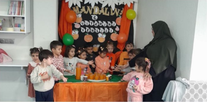 MANDALİNA temalı etkinlikte çocuklar, sağlıklı beslenmenin önemini eğlenceli aktivitelerle keşfetti. Rengarenk mandalinalarla süslenen masalar, balonlarla donatılan sınıf ortamı ve çocukların yüzlerindeki tebessüm, mekânı adeta bir bayram yerine çevirdi.