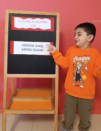ETKİNLİKTE öğrenciler;“Paylaşmayı severim.”, “Hata yapınca özür dilerim.”, “Oyuncaklarımı toplarım.”, “Hayvanları korurum.”, “Herkese saygılı olurum.”, “Elektriği boşa harcamam.”, “Sınıf kurallarına uyarım.”, “Çevremi temiz tutarım.”, “Suyu boşa harcamam.” gibi mesajları hazırladıkları kartlarla hem okudu hem de uygulamalı olarak öğrendi.