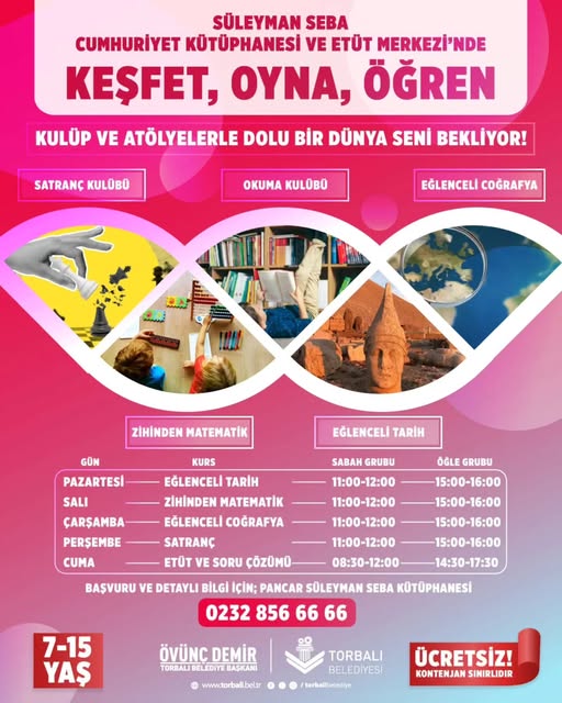 Torbalı Belediyesi, eğitim alanındaki desteklerini sürdürmeye devam ediyor. Pancar’da bulunan Süleyman Seba Cumhuriyet Kütüphanesi ve Etüt Merkezi’nde, çocukların akademik ve kişisel gelişimine katkı sunacak yeni dönem atölye ve kulüp çalışmaları başlıyor.