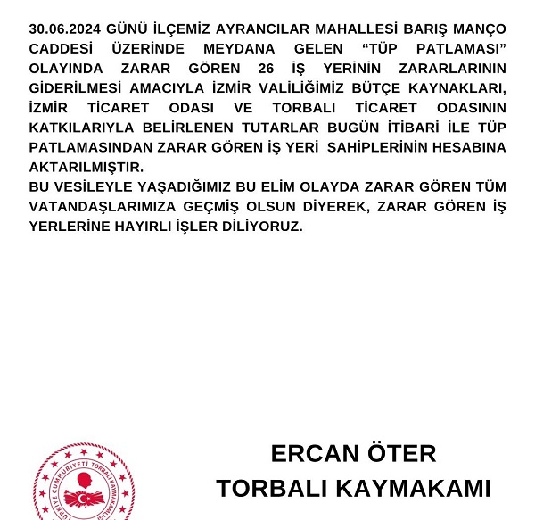 İZMİR Valiliği Bütçe Kaynakları, İzmir Ticaret Odası ve Torbalı Ticaret Odası katkılarıyla belirlenen tutarlar dün itibariyle esnafların hesaplarına yatırıldı. Kaymakamlıktan yapılan duyuruda “30 Haziran 2024 tarihinde Ayrancılar’da meydana gelen tüp patlaması olayında zarar gören 26 iş yerinin zararlarının giderilmesi amacıyla İzmir Valiliği Bütçe Kaynakları, İzmir Ticaret Odası ve Torbalı Ticaret Odası katkılarıyla belirlenen tutarlar bugün itibariyle esnaflarımızın hesabına yatırılmıştır. Bu vesileyle yaşadığımız elim olayda zarar gören bütün vatandaşlarımıza geçmiş olsun diyerek zarar gören işyerlerine hayırlı işler diliyoruz” denildi.