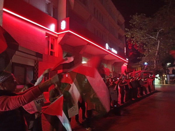 Dün gece Uluslararası İnsani Yardım Filosu Sumud’a yönelik İsrail müdahaleleri başlaması üzerine Torbalılı vatandaşlar, dayanışma için Ziraat Bankası önünde toplandı.