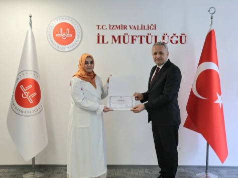 2024 KASIM – 2025 Ocak tarihleri arasında Menderes, Menemen, Konak ve Torbalı İlçe Müftülükleri bünyesinde düzenlenen 3 aylık eğitim programını başarıyla tamamlayan 19’u kadın olmak üzere toplam 72 kursiyer, katılım belgelerini İl Müftüsü Sinan Kazancı’nın elinden aldı.