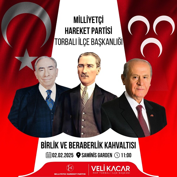 Milliyetçi Hareket Partisi Torbalı İlçe Başkanlığı önümüzdeki Pazar günü birlik beraberlik kahvaltısında bir araya gelecek. İlçe Başkanı Veli Kaçar, kahvaltıya partili partisiz tüm herkesi davet etti.