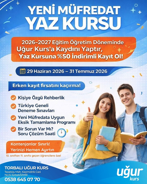 Torbalı Uğur Kurs, 2026-2027 eğitim öğretim dönemine hazırlanan öğrenciler için yeni müfredata uygun yaz kursu programını başlattı. 10. sınıftan 11. sınıfa geçen öğrencilere özel olarak hazırlanan yaz kursu, öğrencilerin eksiklerini tamamlaması ve yeni döneme güçlü bir başlangıç yapması amacıyla planlandı.