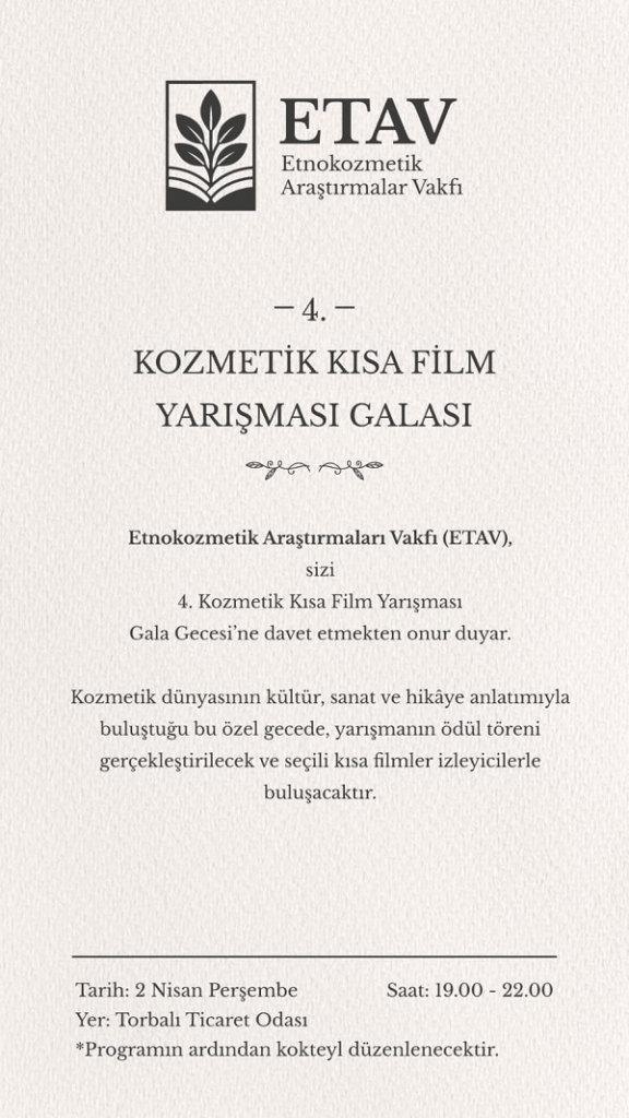 Etnokozmetik Araştırmaları Vakfı (ETAV) tarafından düzenlenen 4. Kozmetik Kısa Film Yarışması kapsamında gala gecesi, 2 Nisan Perşembe günü Torbalı Ticaret Odası Konferans Salonu’nda gerçekleştirilecek.