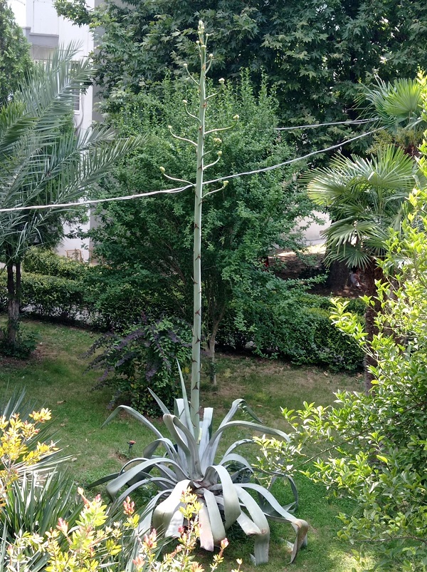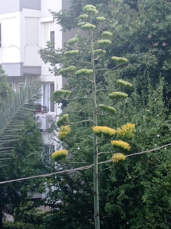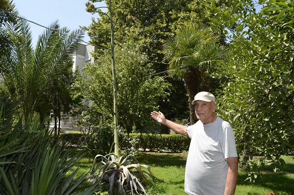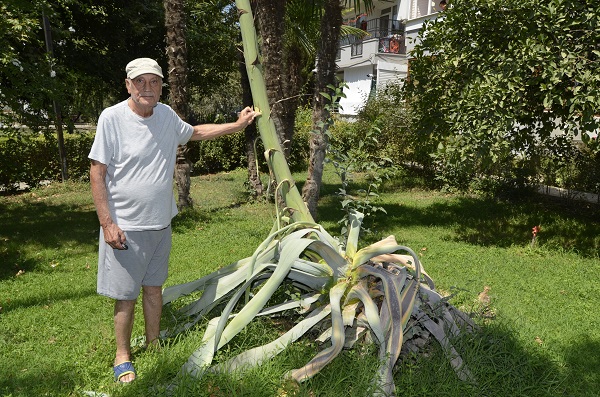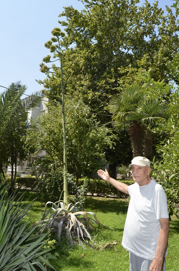 O ZAMANLAR daha küçücük fidan olan ve Mehmet Ali Karayel tarafından ekilen ağaç, 20 yıl sonra çiçek açtı. Yaklaşık bir ay boyunca, çiçekleri üzerinde çok güzel bir görüntü oluşturan Agave ağacı, nihayetinde çiçeklerini dökerek soldu. UNESCO Kültür Mirası Listesi’nde olan ve ömründe bir kez çiçek açan Agave ağacının solması site sakinlerini de üzdü.