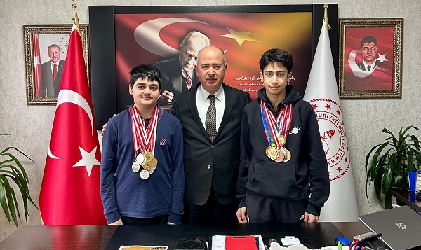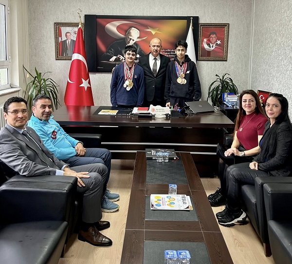 Kadir Kadıoğlu, TÜBİTAK Matematik Olimpiyatları başta olmak üzere çeşitli yarışmalarda ilçeyi başarıyla temsil eden Torbalı BİLSEM öğrencileri Batu Emirhan Arık ve Baran Yavuz ile ailelerini İlçe Millî Eğitim Müdürlüğü’nde ağırladı.